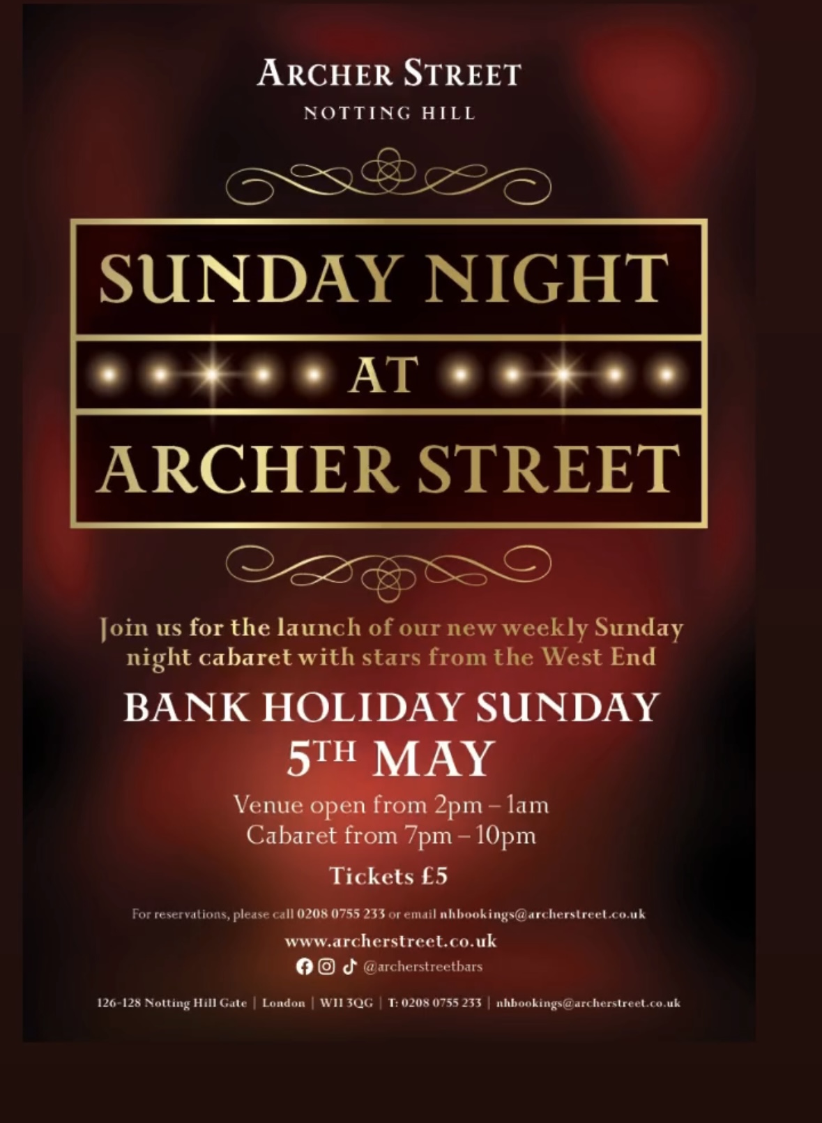 Join us in Archer Street Notting Hill this bank holiday for a Sunday Night Cabaret. It will be an evening to remember, with performances from some exceptional West End stars, followed by dancing and partying until 1am!