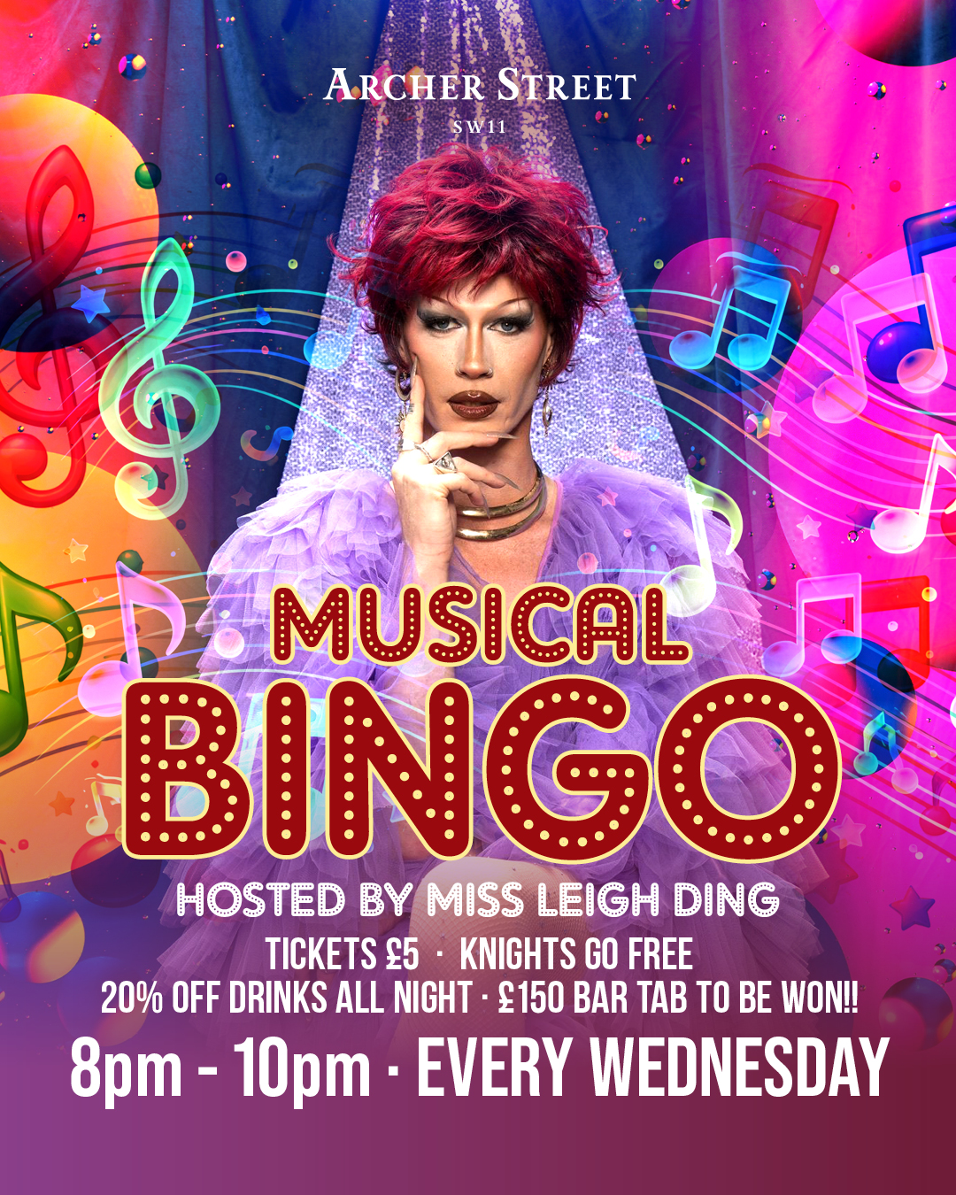 Every Wednesday on Northcote Road, Archer Street SW11 turns up the volume for a night of Musical Bingo madness, hosted by the one and only Miss Leigh Ding and trust us, it’s anything but ordinary. Expect big tunes, big laughs, and full-on chaotic energy as classic bingo meets your favourite songs and yes, there will be singing. Enjoy 20% off drinks all night long, because bingo is far better with a cocktail in hand.✨ What to expect: Hosted by the fabulous Misleading High-energy Musical Bingo games Prizes, laughs & plenty of drama 20% off drinks all night Just £5 per ticket Bring your friends. Bring your partner. Bring your competitive spirit.