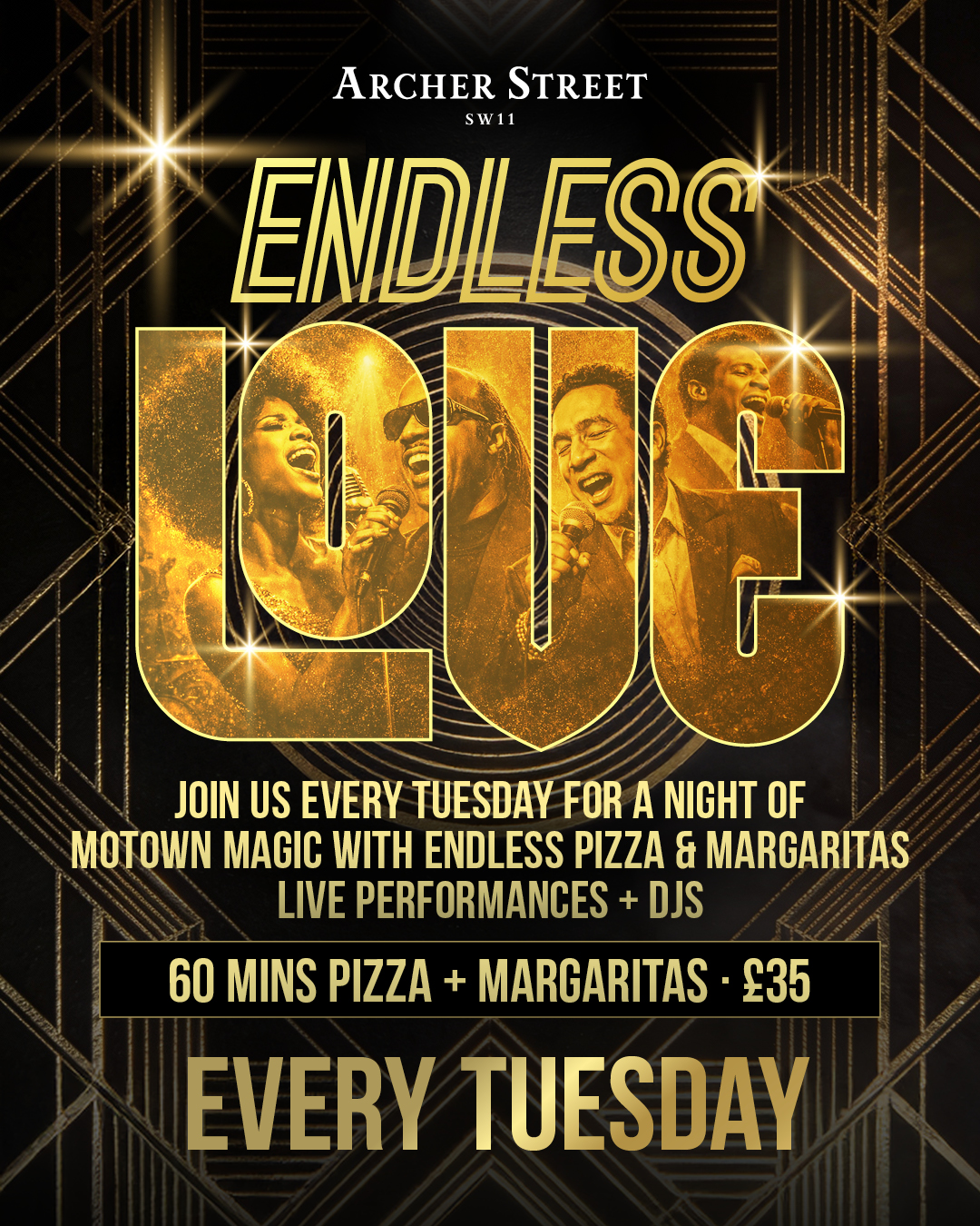 Join us every Tuesday night at Archer Street SW11 for Endless Love. A Motown-fuelled party you won’t want to miss. From 6pm, join us in Clapham SW11 for an unforgettable evening of endless Motown classics, brought to life by our incredible live singers and DJs. Expect big voices, feel-good vibes, and nonstop entertainment from start to finish. Enjoy 60 minutes of endless pizza and endless margaritas for just £35. Unlimited slices, unlimited cocktails, and unlimited good times. ✨ What’s included: Live singers & DJs with a Motown twist 60 minutes of endless pizza 60 minutes of endless margaritas £35 per person Whether you’re planning a midweek catch-up, a birthday celebration, or just an excuse to dance, Endless Love Tuesdaysis your new Tuesday night obsession. Every Tuesday from 6pm at Archer Street SW11. Come hungry. Come thirsty. Come ready to dance. 💃🕺