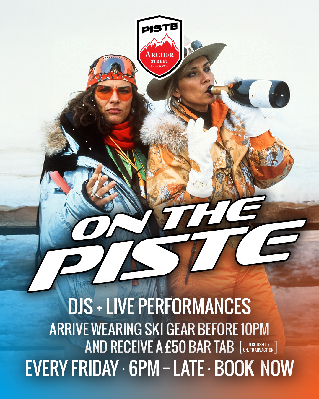 Après-ski. Archer Street style. Friday nights go full alpine as On The Piste transforms the lower ground into an immersive mountain party playground. Think chalet vibes, high-energy anthems, and that hands-in-the-air-at-altitude feeling — no lift pass required. Expect a DJ-led party flow soundtracking the night, with hourly BBC / Grandstand / Euro POPski theme drops to keep the energy climbing. Themed styling, playful moments, and pure alpine chaos set the scene. Dressed for the slopes? Arrive before 10pm in full ski gear and receive a £50 bar card (single transaction). Shots up. Goggles on. Let’s get piste.