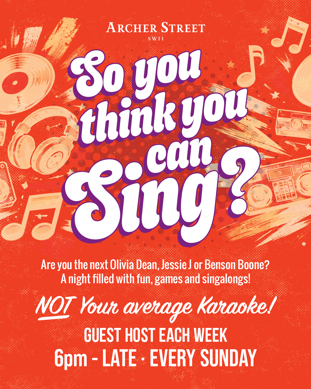 So You Think You Can Sing? 🎤 Karaoke - but not as you know it. As Archer Street hands over the mic for a high-energy, community-driven sing-off. So You Think You Can Sing? is a hosted karaoke experience designed to bring people together, spotlight local talent, and turn the audience into the stars of the show. With open sign-up on the night, anyone can take their shot in the spotlight - and every performer receives one complimentary drink to keep those vocal cords warmed up. Expect a different guest host each week, big crowd energy, and a room full of future headliners (or at least future legends). It’s your stage. Own it. 🎶