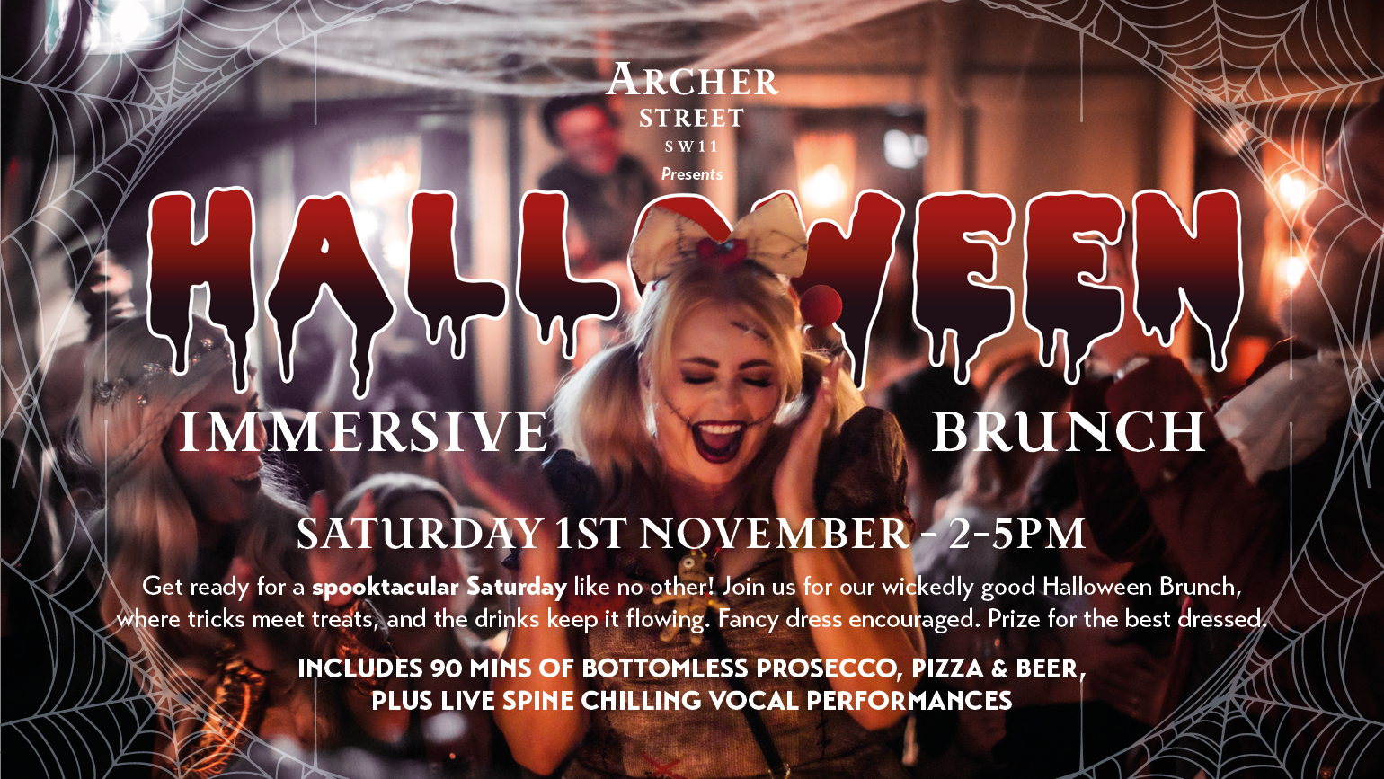 🎃 A Spine-Chilling Halloween Bottomless Brunch at Archer Street SW11 👻 Get ready for a frightfully fantastic Halloween afternoon like no other at Archer Street SW11! ✨ Indulge in 90 minutes of bottomless prosecco, beer, and delicious pizza, all while being serenaded by live vocal performances of spooky classics and