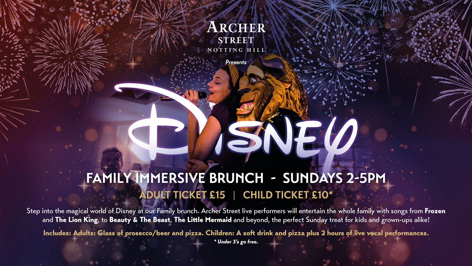 Sundays 2-5pm Adult ticket £15 *Child ticket £10 Step into a world of magic and music at our Disney Family Brunch. Get ready to be taken to infinity and beyond with live performances of all your favourite Disney hits – from Frozen and The Lion King, to Beauty & The