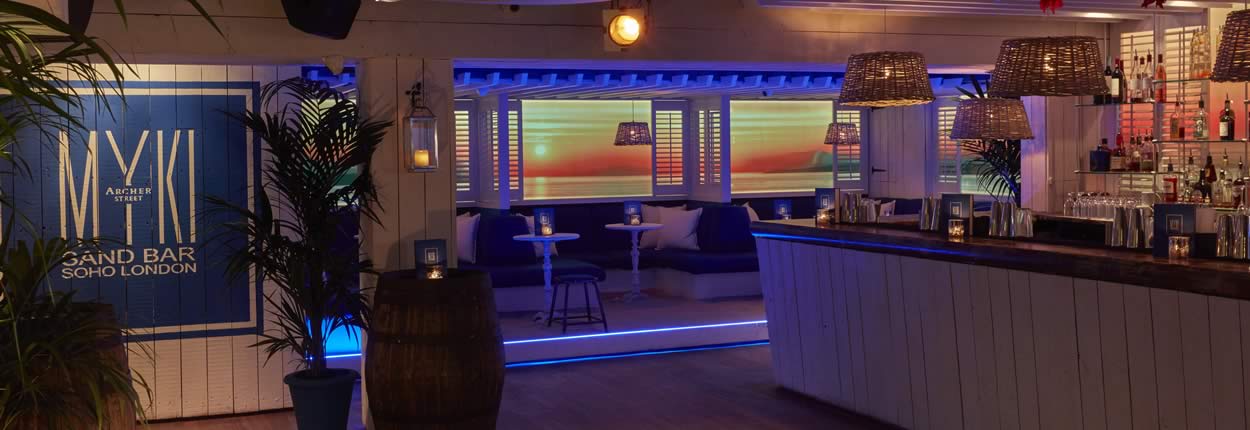 ‘Life’s a beach in Archer Street Soho’s lower ground floor with this summer’s pop-up Soho Beach Bar. Escape London’s bustling streets to your favourite European beach bar inspired by the shores of Mykonos with white and blue interiors, tropical palms and sun loungers. Sip on our new and fresh cocktail menu – think fresh cucumber, kaffir lime, coconut water with rum.